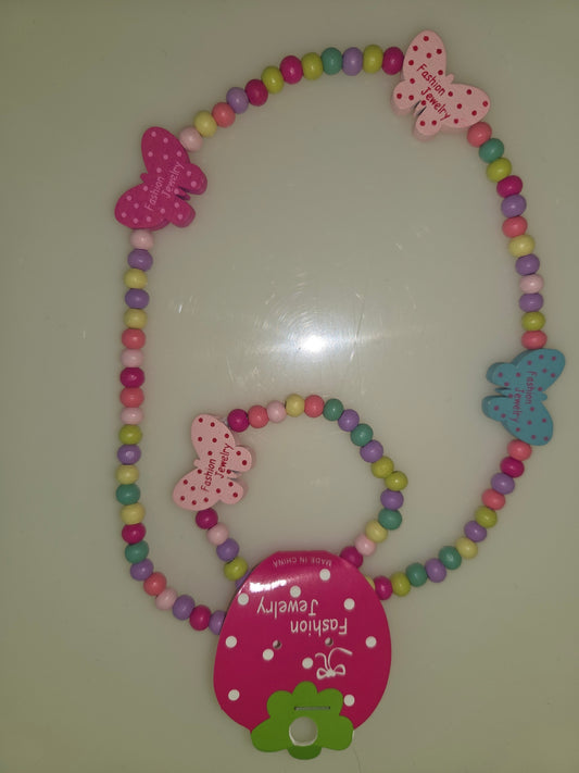 Maple Wood & Acrylic Kids Jewelry Set, Stretch Beaded Necklace & Bracelet with Butterfly Decor